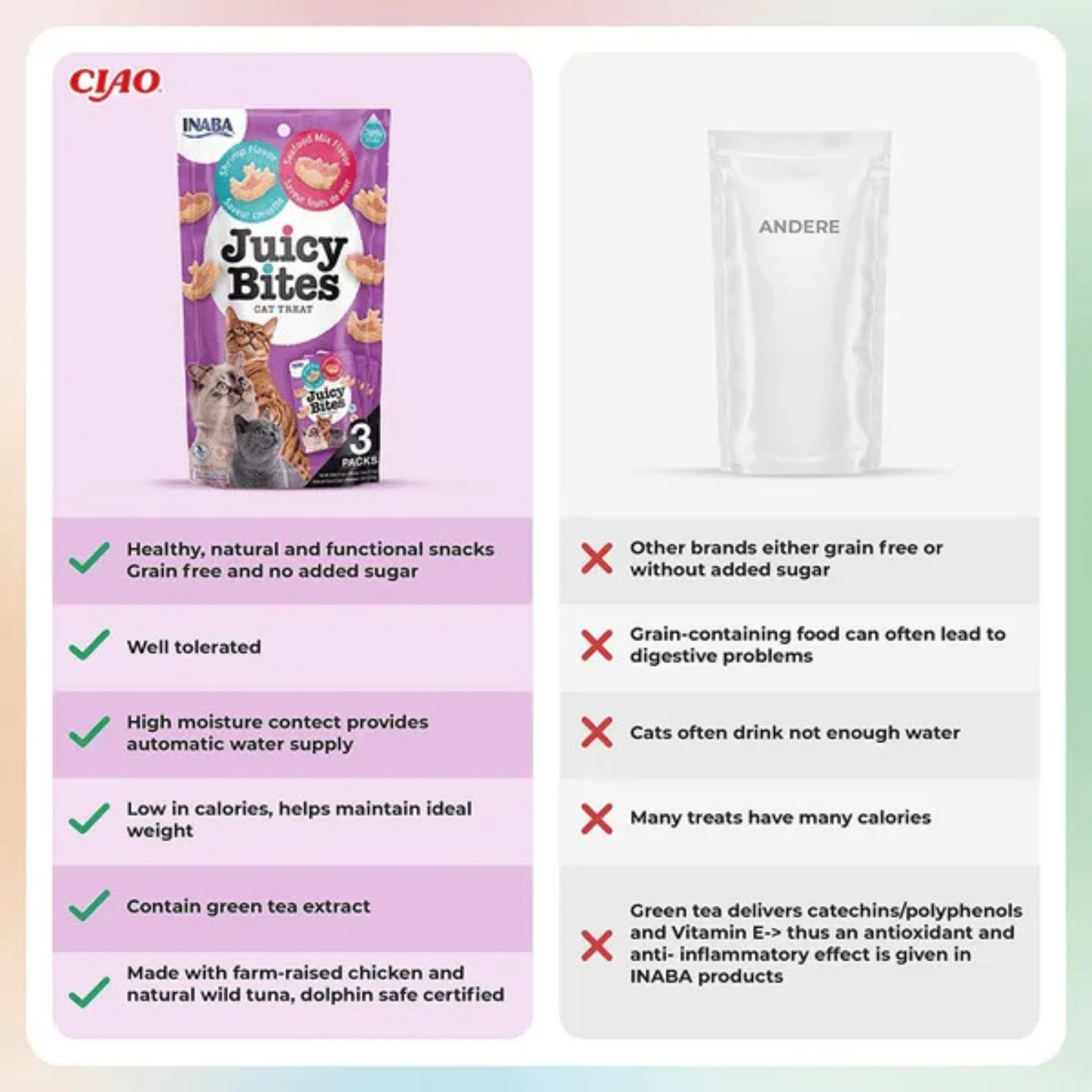 Juicy Bites are irresistibly moist, bite-sized soft tuna and chicken treats seasoned with natural flavors, green tea extract and vitamin E. No grains, preservatives or artificial colors. Each package includes three individual treat packs to maintain maximum freshness and each treat pack has two fun shapes in two different flavors to keep cats satisfied.