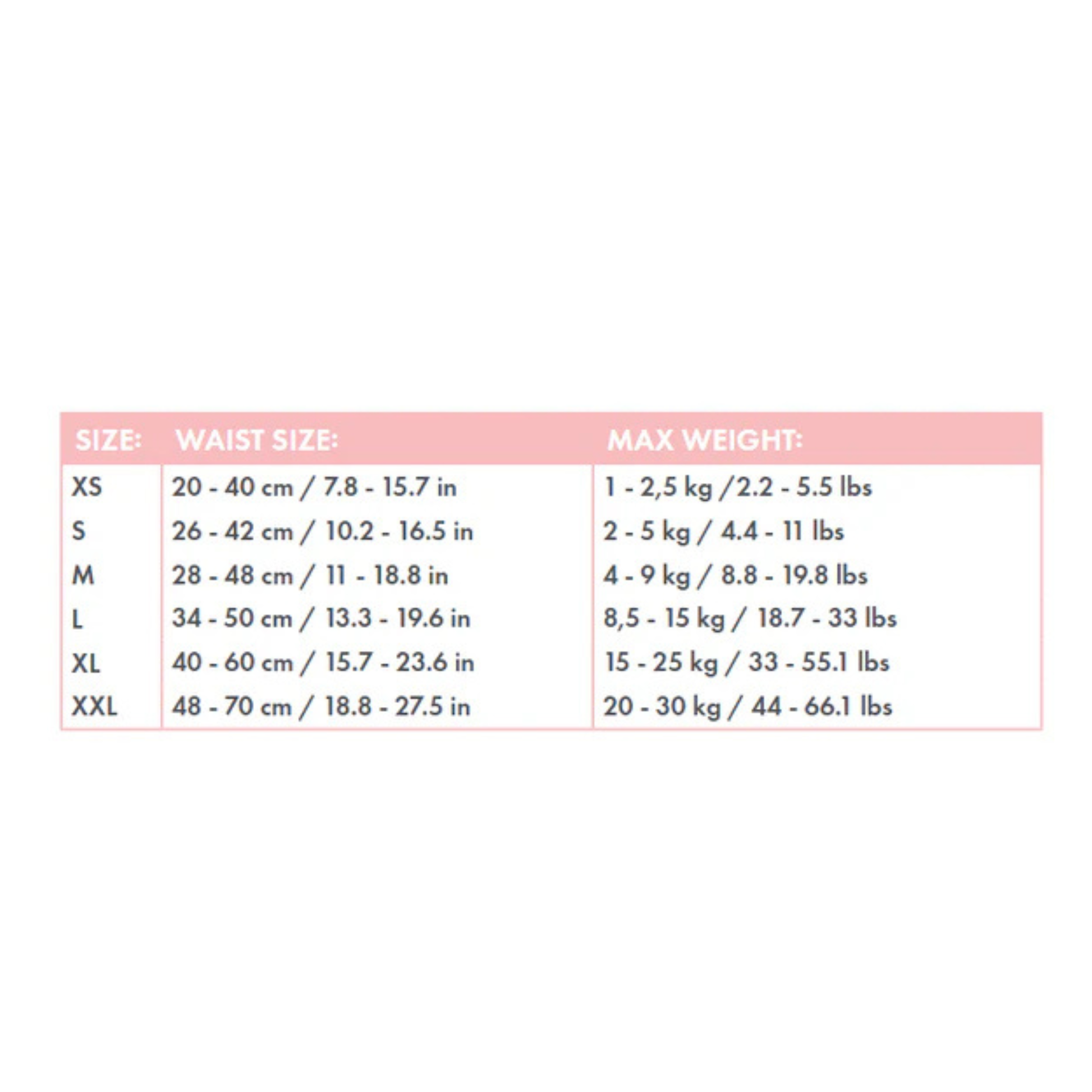 XS:20 - 40 cm/1 - 3 kg